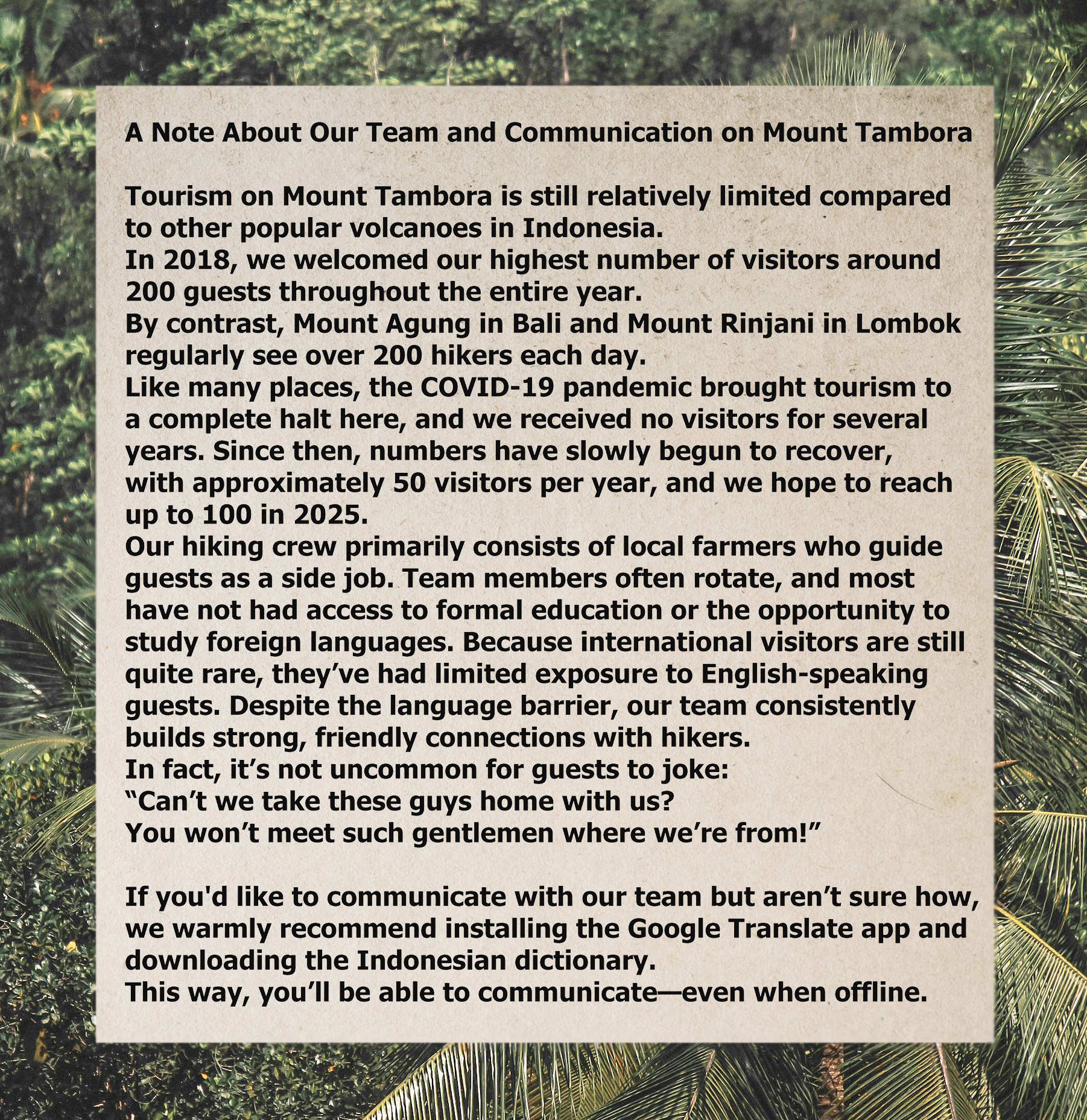 The mission of this website is to promote Mount Tambora as a premier destination. In April 2015, the area was officially designated as Mount Tambora National Park, and ongoing efforts aim to increase visitor numbers. We are committed to supporting local community development and improving the standard of living for residents. To that end, we coordinate closely with the local guiding association based in the nearby town of Oi Bura.