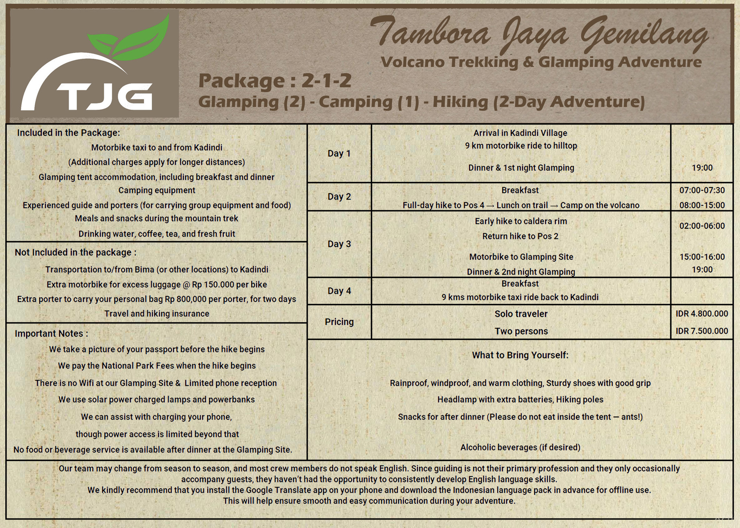 After completing the hike on day 2 or day 3, you may want to head to Bima to catch an early flight the following morning, or travel to Labuan Jambu to see the whale sharks the next day. This means you will not be staying a second night at our Glamping site; therefore, we will offer you a discount so you can spend that night elsewhere.